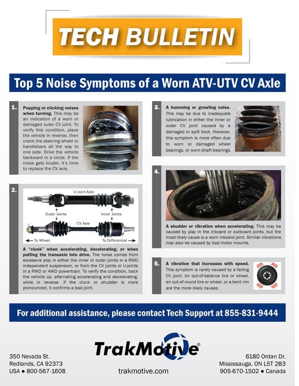 This may be an indication of a worn or damaged outer CV joint. To verify this condition, place the vehicle in reverse, then crank the steering wheel or handlebars all the way to one side. Drive the vehicle backward in a circle. If the noise gets louder, it’s time to replace the CV axle.