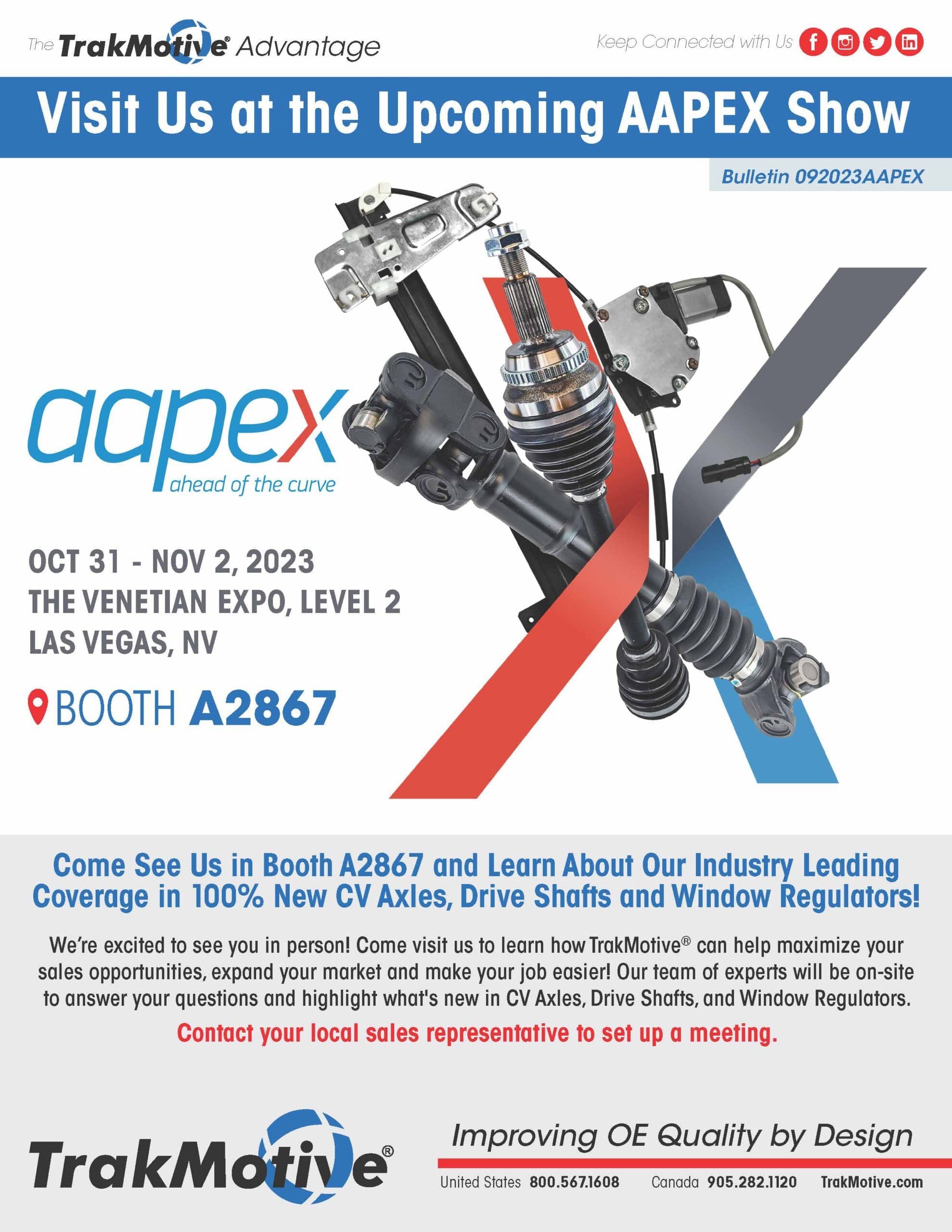 Come See Us in Booth A2867 and learn about our industry leading coverage in 100% New CV Axles, Drive Shafts and Window Regulators!