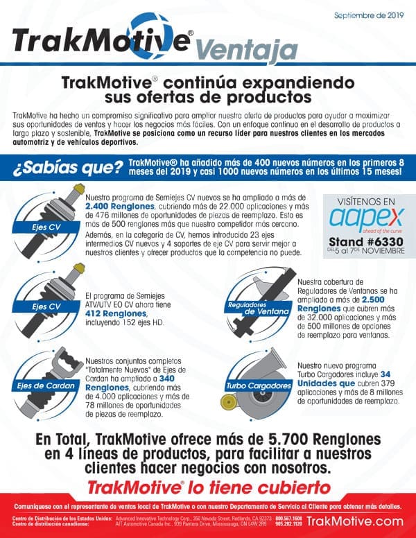 TrakMotive ha hecho un compromiso significativo para ampliar nuestra oferta de productos para ayudar a maximizar sus oportunidades de ventas y hacer los negocios más fáciles. Con un enfoque continuo en el desarrollo de productos a largo plazo y sostenible, TrakMotive se posiciona como un recurso líder para nuestros clientes en los mercados automotriz y de vehículos deportivos.